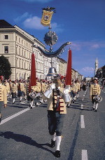 Münchens stadsvapen: Münchner Kindl: Framför festtåget med folkdräkter vandrar sedan 1938 Münchner Kindl, som representerar förbundslandet Bayerns huvudstad München. Münchner Kindl kan man även hitta på Münchens stadsvapen.